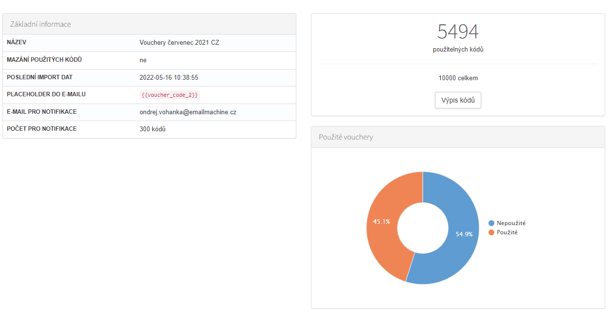 V seznamu voucherů můžete sledovat které kódy jsou přiřazené, případně v jaké kampani. Použité vouchery můžete zobrazit zvlášť, vyexportovat, nebo smazat.